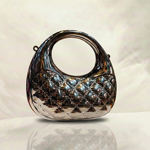 Apne evening look ko mazeed haseen banayein is Hot Pink Metallic Sculpted Ring Clutch ke saath. Iska futuristic design aur high-gloss mirror finish ise kisi bhi party ya special event ke liye ek perfect statement piece banata hai.